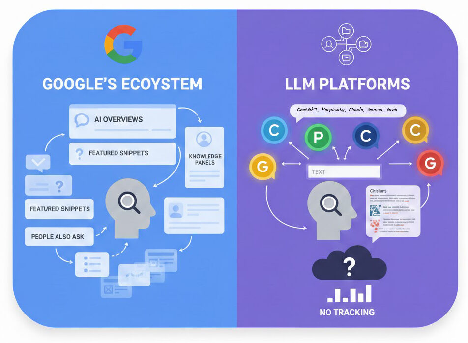 When I talk about zero-click SEO, I’m talking about two distinct battlegrounds where your brand needs to show up. They require different strategies but share similar fundamental principles.